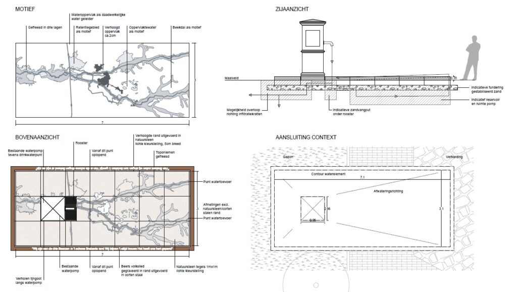 Wat we links bovenaan zien: Rondom de dorpspomp is een natuurstenen plateau gecreëerd waarop je de drie dorpen ziet en de loop van de Grote en de Kleine Beerze. Het water van de beken stroomt over het plateau en in de randen is het “Beerse volkslied” zichtbaar. Door het verse drinkwater uit de pomp en het regenwater te hergebruiken voor circulair, schoon stromend water zorgt dit ook voor duurzaamheid. Bij overschot wordt het water weer gefilterd en bij langdurige droogte incidenteel aangevuld met drinkwater.